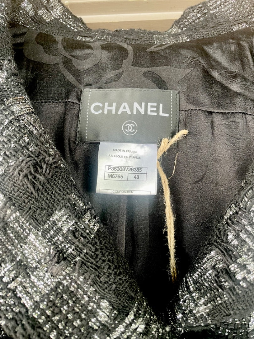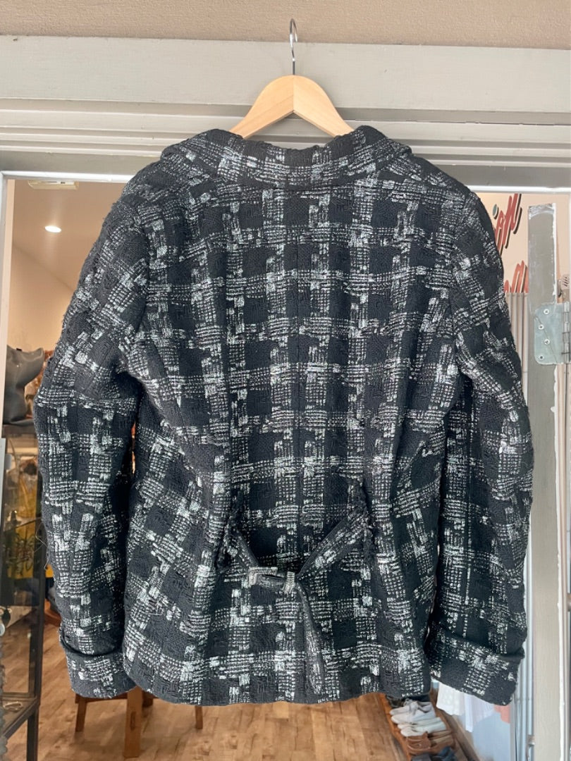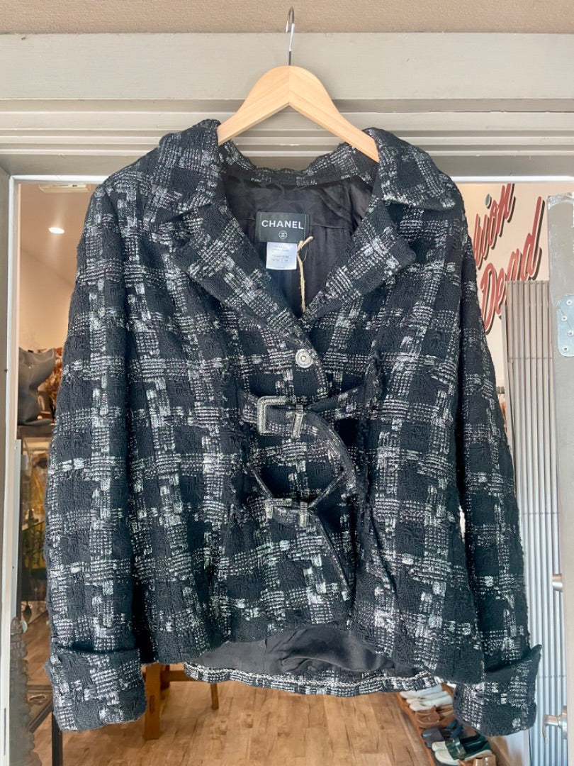 Chanel Black/Silver Tweed Buckle Jacket, 48