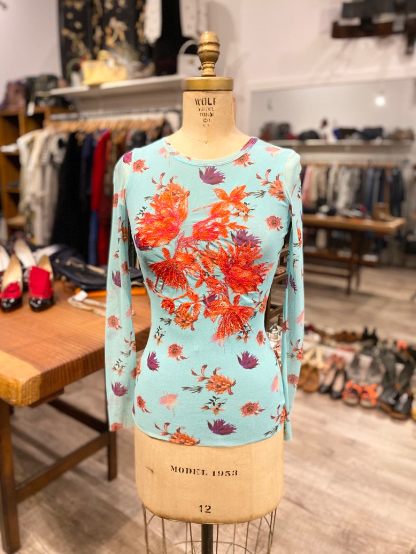 Fuzzi Blue Red Embroidered Mesh Floral Blouse, Small